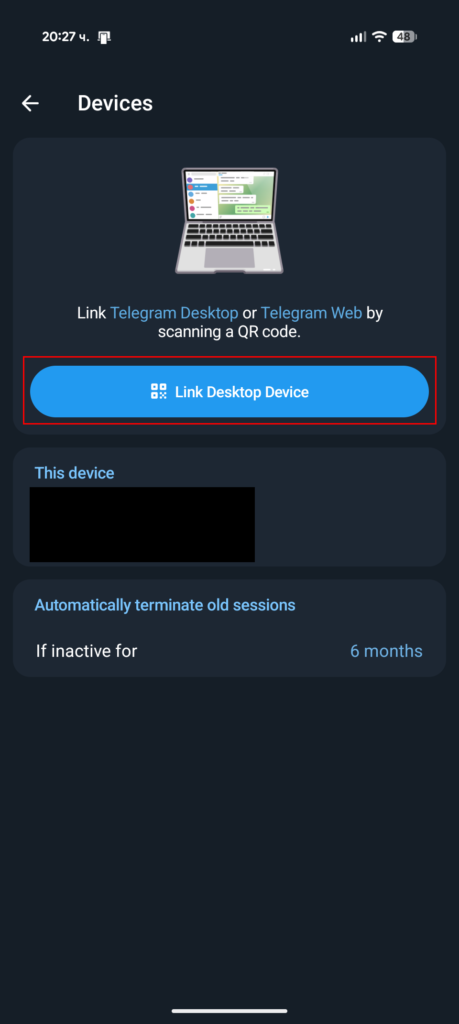 - След това „Link Desktop Device“. Ще се появи поле за сканиране на QR код, в което може да сканирате кода от телеграм страницата тук.