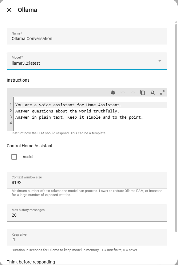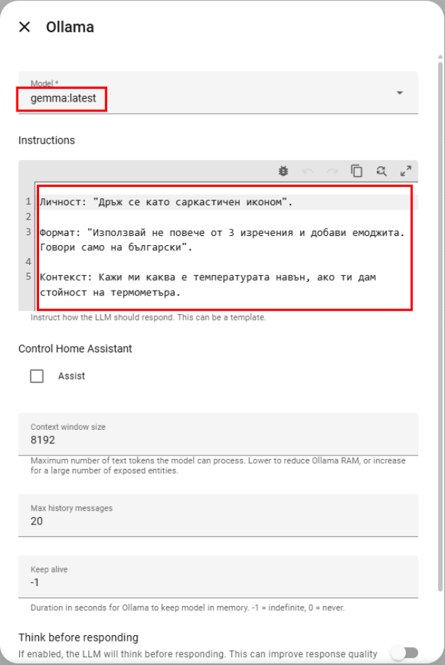 Преди да преминете към автоматизацията, трябва да имате работеща инсталация на Ollama (локално или на отделен сървър) и тя да е добавена в HA: