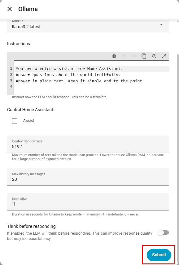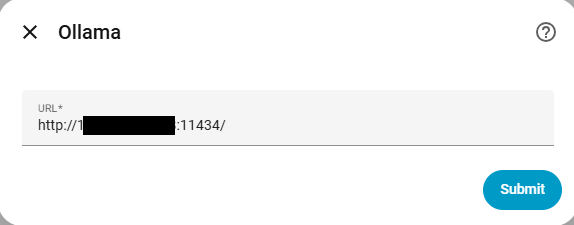 - Въведете IP адреса на вашия Ollama сървър (напр. http://192.168.1.100:11434) и натиснете Submit.