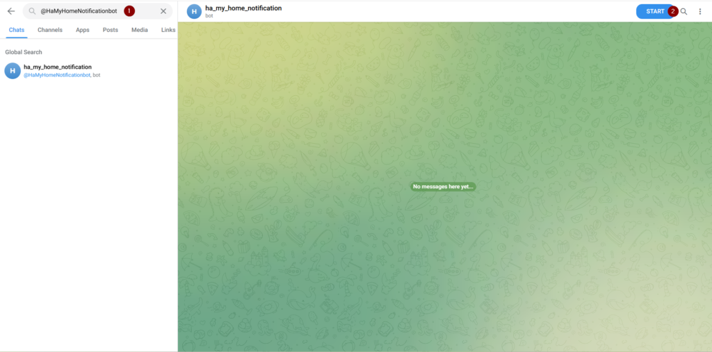 - За да завършим регистрацията и да получим нашето id, трябва да стартираме разговора с бота. Намерете името на бота @HaMyHomeNotificationbot в Search полето (1) на Telegram и натиснете бутона Start (2)