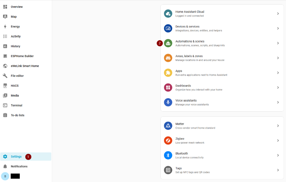 - Отидете на “Settings” (1) и изберете “Automations & scenes”