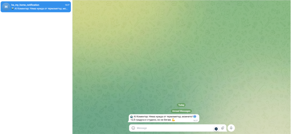 След като вече имате работеща връзка между HA, Ollama и Telegram, възможностите са почти неограничени. Ето няколко идеи какво още можете да автоматизирате: