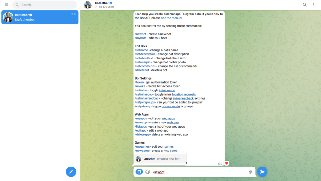 - Изпратете му съобщение „/newbot“